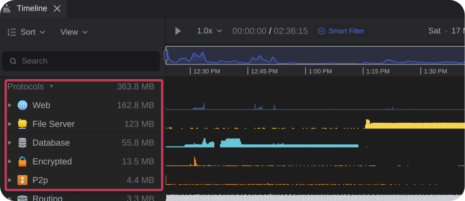 Use the timeline search field to find specific protocols within the current data set. Enter a protocol name to update the timeline and display matching results.
