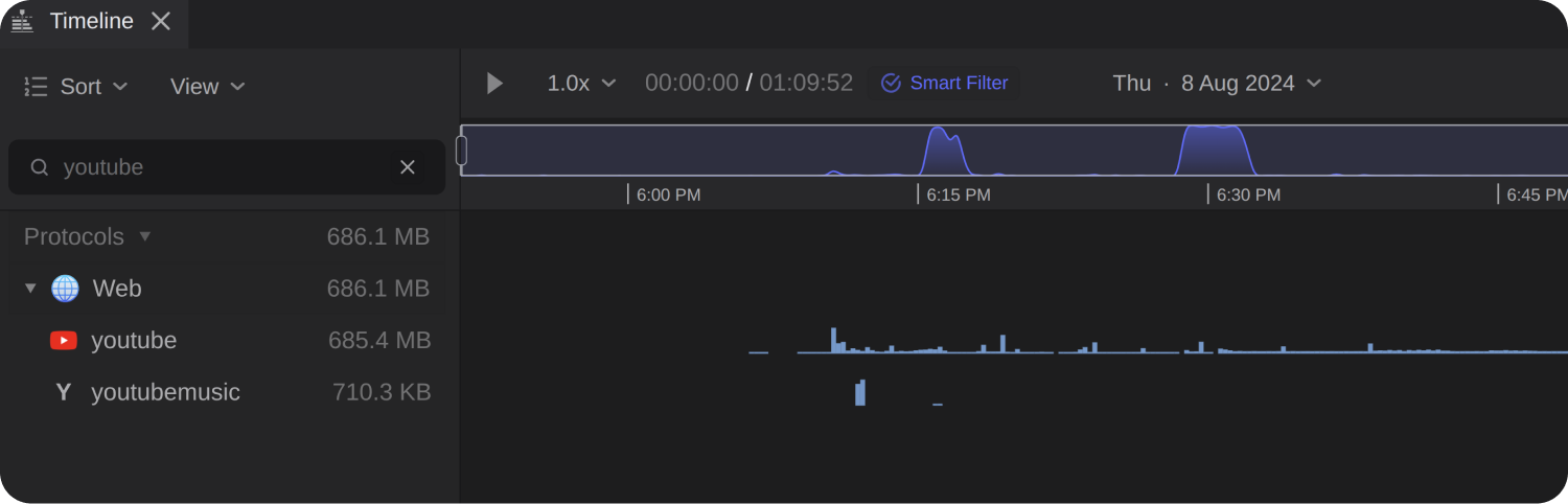 The Timeline provides an interactive view of all network traffic captured in the project telemetry. Each block represents a specific time interval during which data was transferred. Hovering over a protocol block displays the amount of data transferred during that interval. Selecting traffic populates the Inspector panel with detailed information about the associated flow(s).