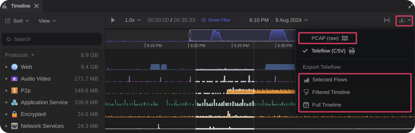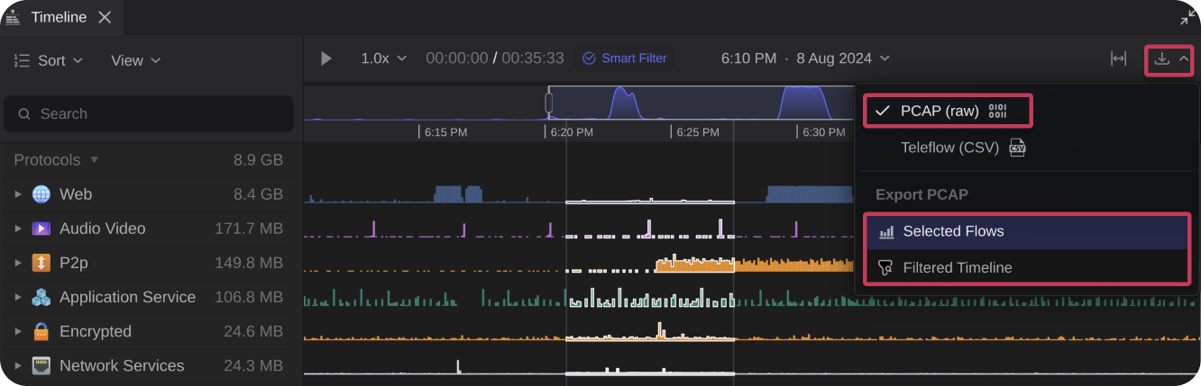 The timeline can be exported as a PCAP file. The export for Selected Flows includes only the data flow blocks selected, while the export for Filtered Timeline includes only the data visible at the current zoom level and respects any active filters.