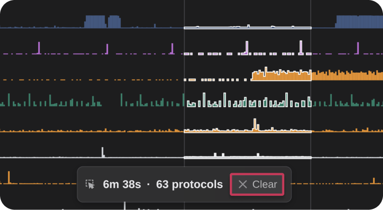 Clear timeline selections at any time by selecting Clear when it appears, or by clicking the background area between swim lanes. Clearing a timeline selection also clears related selections in the Inspector and Network panels.