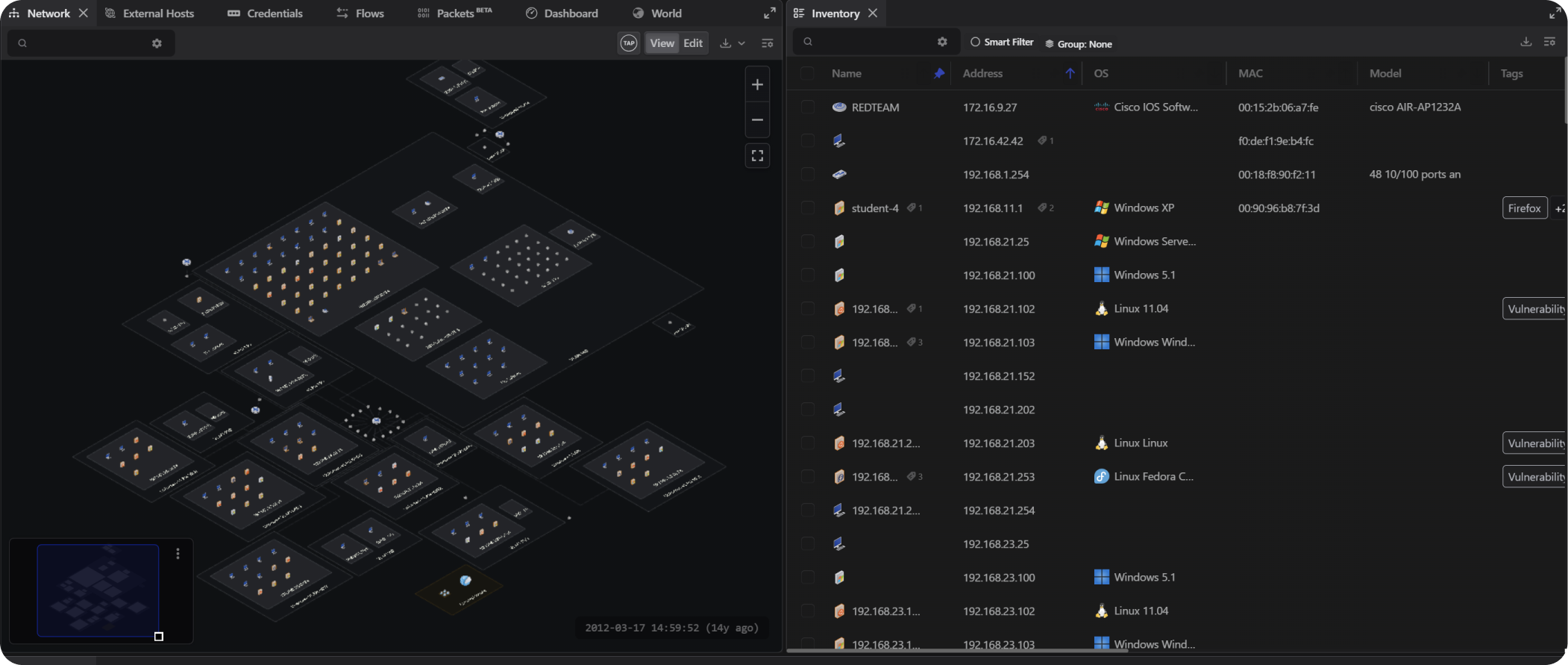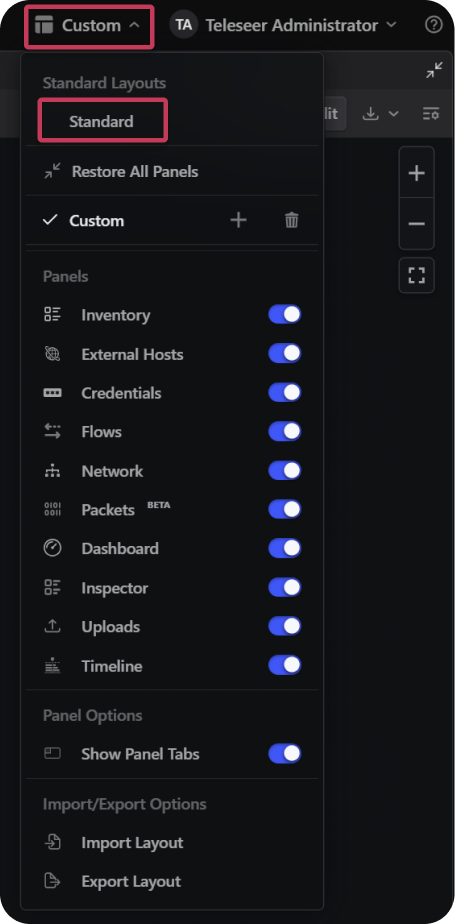 Each panel can be moved and resized to create a custom workspace. For example, you can view the Network topology and Inventory tab side by side by repositioning the Inventory tab, or maximize the Network topology to fill the entire screen using the maximize button.