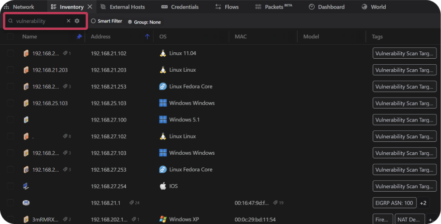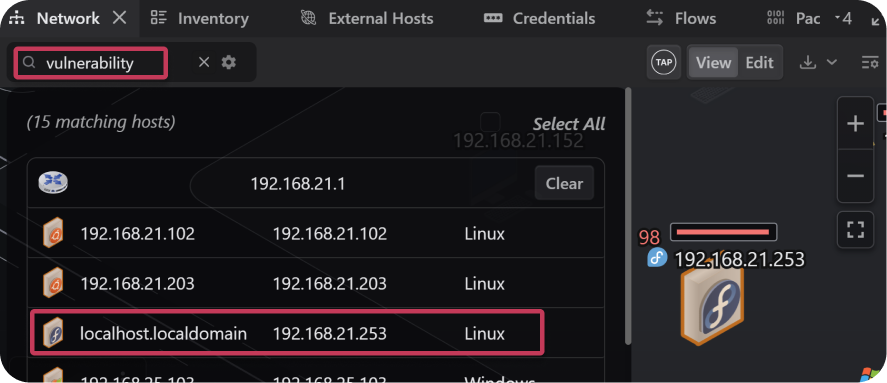 Vulnerable hosts can be found by scanning the Network topology for hosts outlined in orange, reviewing their vulnerability scores, or searching for the vulnerability tag in either the Network or Inventory tab.